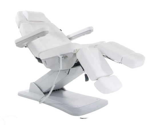 Trzy siłowniki elektryczne umożliwiają płynną regulację wszystkich kluczowych elementów, a minimalistyczna forma sprawia, że fotel doskonale wpasowuje się w nowoczesne wnętrza gabinetów podologicznych, kosmetycznych i medycznych.