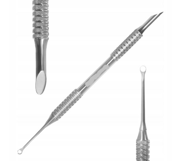 Profesjonalne narzędzie ze stali nierdzewnej, przeznaczone do wykonywania manicure i pedicure. Część robocza „pusher skośny” służy do podnoszenia i odsuwania szorstkich i mocno osadzonych skórek. Część robocza posiada skos, który zapewnia wygodę i dokładność podczas pracy. „Pierścień”, przeznaczony do oczyszczania płytki paznokcia ze skrzydlika. Pterygium to nadmiar skóry, który może gromadzić się na płytce paznokcia.