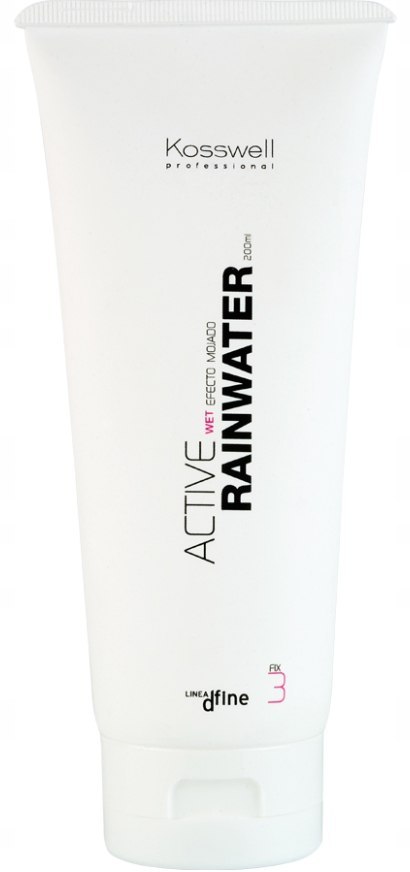 Kosswell Active Rainwater - mocny żel do włosów  pozwala uzyskać efekt tzw. „mokrej włoszki”. Najlepiej sprawdzi się w przypadku włosów średniej długości i krótkich. Kosswell Active Rainwater pozostawia włosy utrwalone, miękkie i jednocześnie lśniące na wiele godzin także w trudnych warunkach atmosferycznych. Utrwala fryzurę na poziomie 3.
